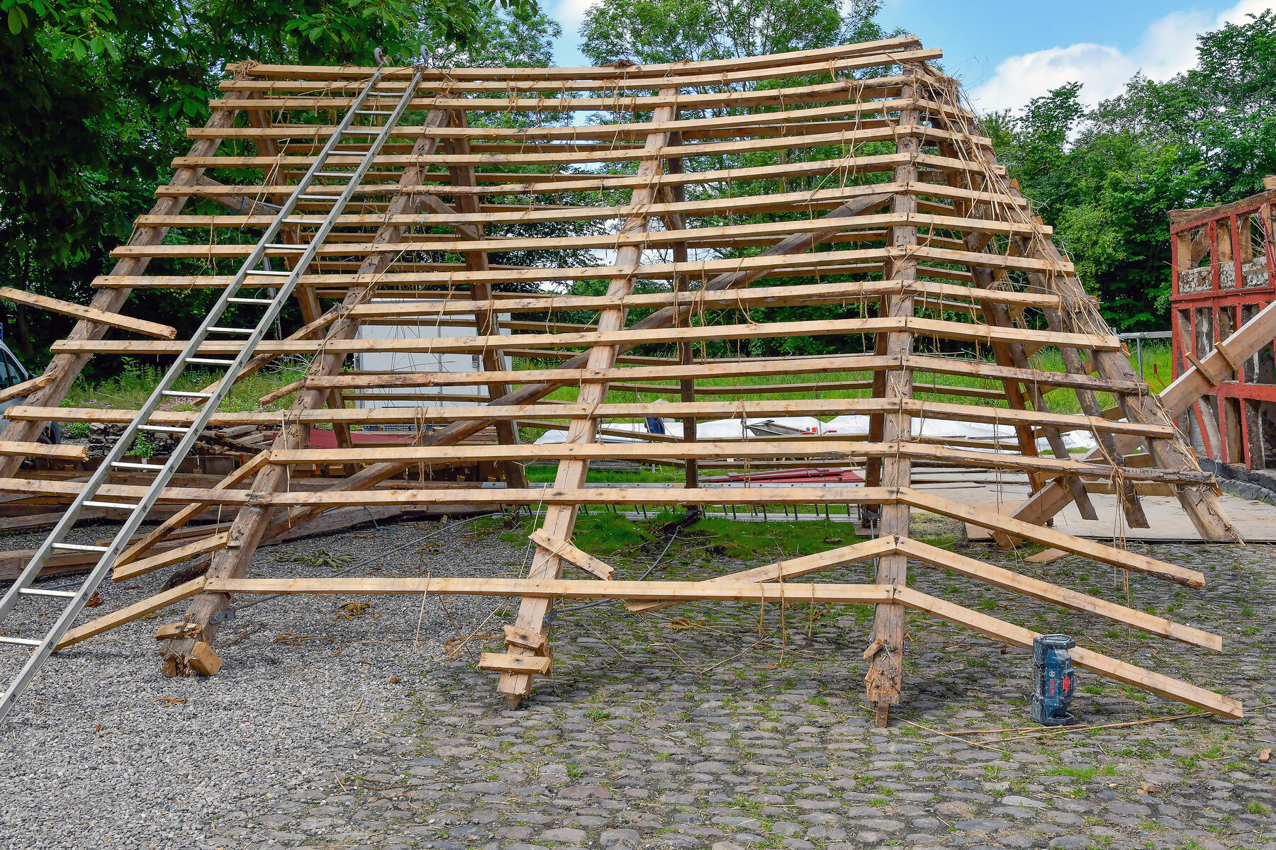 Vore dedikerede medarbejdere har travlt med nedbrydningen, hvor foreløbig stråtaget har måtte vige, da det ikke kan bruges længere. Umiddelbart herefter følger alt tømmer og murværk for derefter igen at genopstå nyrenoveret og klar til at klare de kommende mange dekaders mod- og medvind.